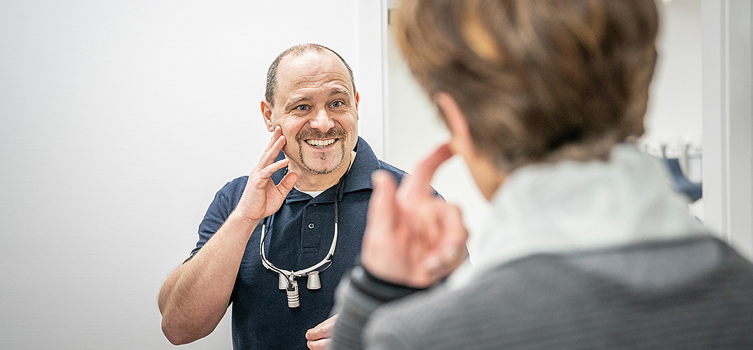 Diese beseitigen wir mittels Einschleifen der Kontaktpunkte sowie Aufbau wichtiger Funktionsflächen der Zähne. Im Zuge der CMD-Behandlung lassen wir von unserem hauseigenen Meisterlabor einen Aufbissbehelf (Knirscherschiene) anfertigen. Diesen trägt der / die Patient*in nachts zur Entlastung der Kiefergelenke und zur Entspannung der Kaumuskulatur. Das Fortschreiten der Symptome aufzuhalten und zu beseitigen, erfordert viel Geduld und Fingerspitzengefühl.